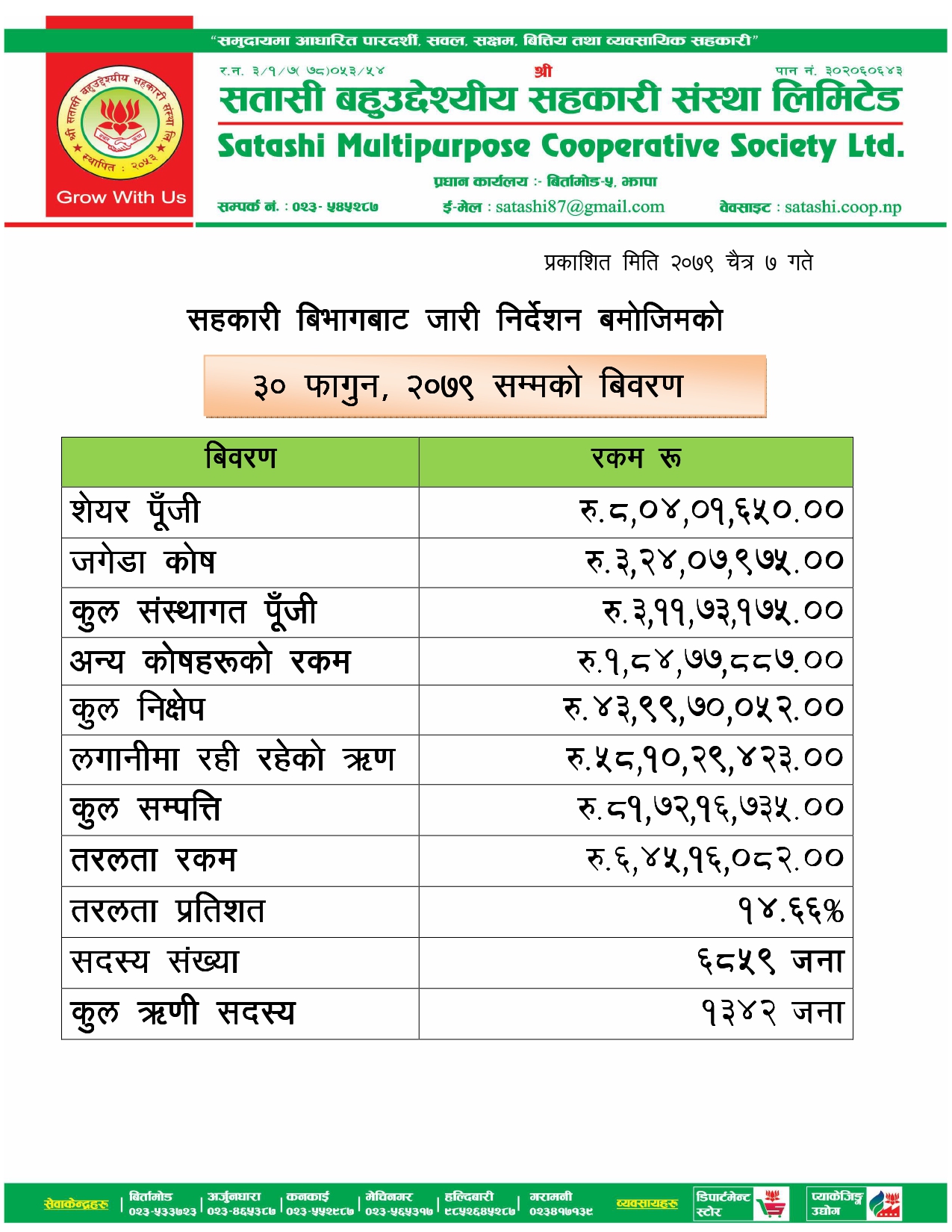 सहकारी बिभागबाट जारि निर्देशन बमोजिम २०८० बैशाख मसान्त सम्मको बित्तीय बिवरण